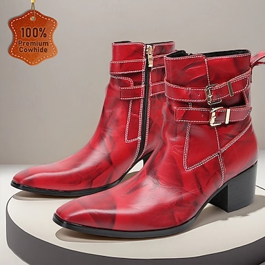 Botines rojos de piel para hombre con doble hebilla y tacón cuadrado, de diseño elegante y a la moda, perfectos para reuniones navideñas y celebraciones festivas con ambiente navideño.