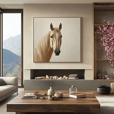 Pintura abstracta de un caballo pintada a mano, pintura abstracta de animales de gran tamaño, arte mural beige, arte abstracto moderno, arte en lienzo grande, pintura acrílica