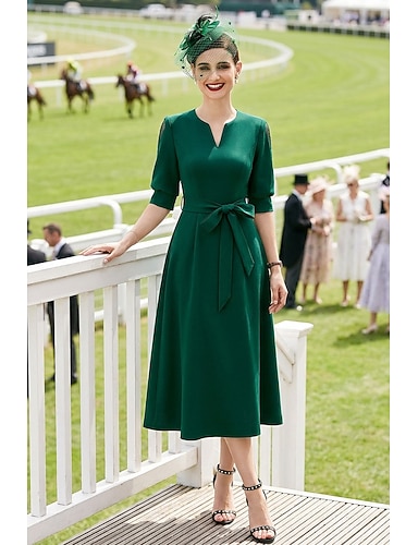 Vestido de fiesta A-line de té longitud vestido de cóctel vestido de invitada de boda vestido de madre de la novia manga 3/4 escote en V elegante vintage fiesta con pliegues