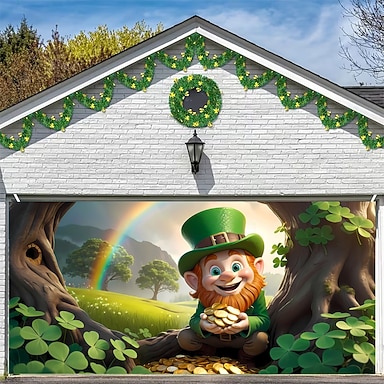 Día de San Patricio tapiz Cubierta de puerta de garaje Gran colgante Elfo Estilo lindo 3D Fiesta Al Aire Libre Vacaciones Fondos de disparos Yarda Decoración del hogar