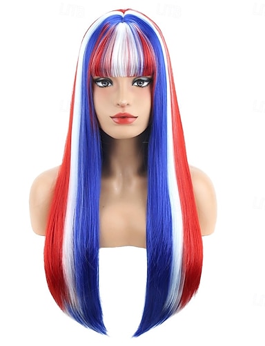 Peluca roja blanca y azul con flequillo pelucas para mujeres y niñas del 4 de julio peluca larga y recta de disfraz sintética y resistente al calor para cosplay