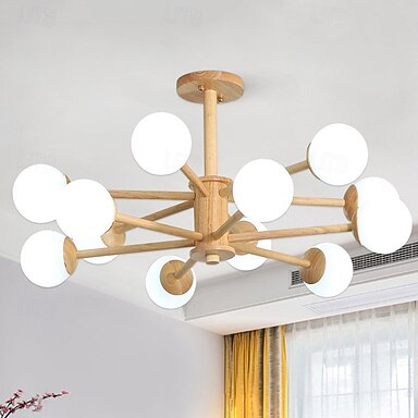 Lámpara de techo colgante de diseño Sputnik, contemporánea, de madera, con 6/8/12 luces y pantalla de bola de cristal blanco en madera natural.