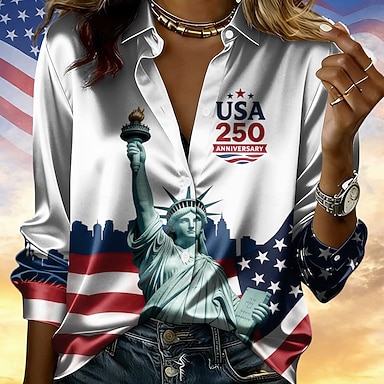 Camisa de satén para mujer con motivo del 250.º aniversario de la independencia estadounidense, con estampado de bandera estadounidense, para vacaciones, a la moda, para uso diario, de manga larga y