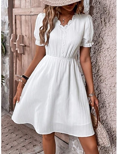 Mujer Mini vestido Vestido de encaje blanco Elegante Moda Moderno Exterior Vacaciones Noche Ajuste regular Plano Manga Corta Escote en Pico Blanco Verano Primavera