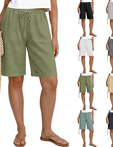 Mujer Pantalones Capri Pantalón corto Pantalones cortos de lino Pantalones cortos de verano Vacaciones Moda Básico Longitud de la rodilla Media cintura Plano Correa Bolsillo Cintura elástica Ligero