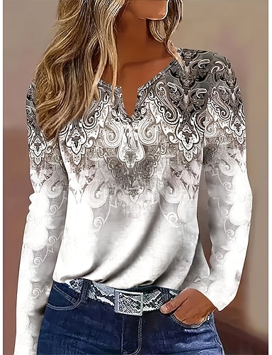 Mujer Camiseta Estampado Graphic Plantas Tribal Vintage Elegante Clásico Manga Larga Escote en Pico Cuello con muescas. Tops regulares Diario Fin de semana Gris Claro Primavera Otoño Invierno