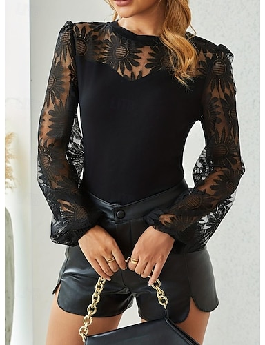 Mujer Top de empalme de encaje Camisetas con bordado ojal Top ajustado Bordado Floral Elegante Moda Casual Manga Larga Manga de la linterna Cuello Barco Escote Redondo Tops regulares Diario Noche
