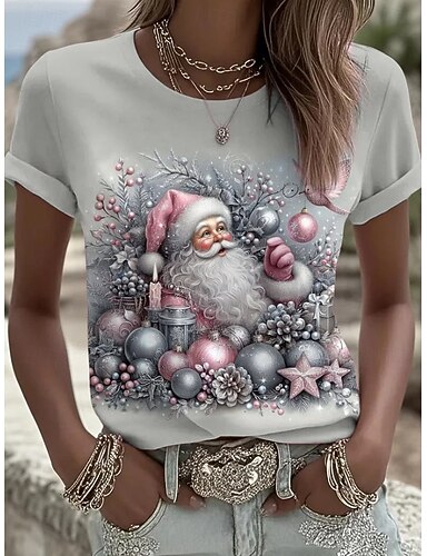 Navidad Mujer Camiseta Estampado Graphic Navidad Vintage Elegante Clásico Manga Corta Cuello Barco Escote Redondo Tops regulares Diario Azul Piscina Negro Blanco Rosa Rojo Verano Primavera Otoño