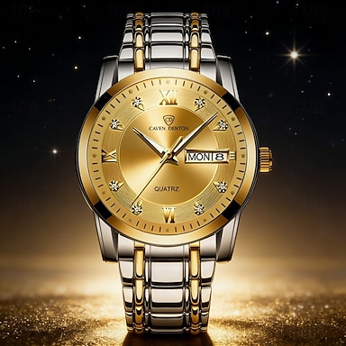 Conjunto de relojes para parejas, relojes a juego para él y para ella, reloj de pulsera de cuarzo de acero inoxidable dorado bicolor con indicador de día y fecha, resistente al agua, regalo para