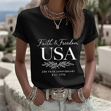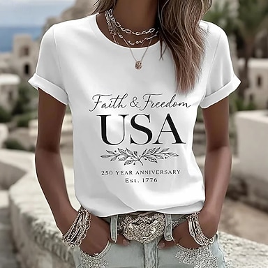 día de la independencia americana Mujer Camiseta Estampado Graphic Letra Vintage Elegante Clásico Manga Corta Escote Redondo Tops regulares Diario Azul Piscina Negro Blanco Rojo Verano Primavera