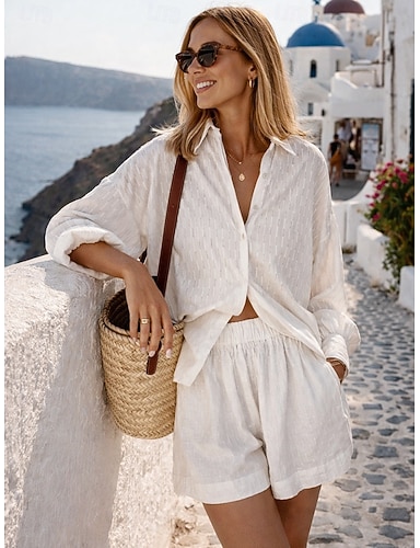 Mujer Conjuntos de pantalones cortos Manga Larga Cuello Camisero Color sólido Moda Ropa de calle Casual Diario Exterior Negro Blanco Amarillo Verano Holgado