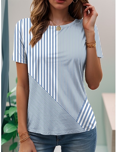Camiseta Waffle de Mujer Estampada de Rayas Gráfica de Rayas Abstracta Vintage Estilo Clásico de Manga Corta Cuello Redondo Regular Tops Diarios Azul Rosa Naranja Verde Verano Primavera