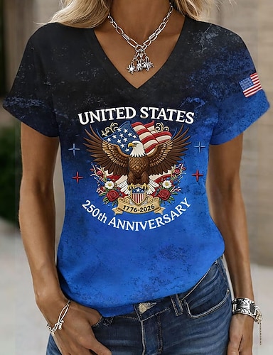 día de la independencia americana Mujer Camiseta Estampado Graphic Bandera Elegante Clásico Casual Manga Corta Escote en Pico Tops regulares Diario Azul Piscina Rojo Rojo azul Verano Primavera