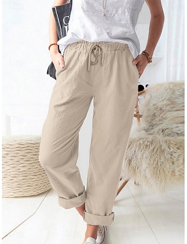 Mujer Lino de algodón sintético Pantalones de verano Pantalones Casual chino Longitud total Cintura Media Color sólido Negro Blanco Verde Trébol Caqui Primavera, Otoño, Invierno, Verano