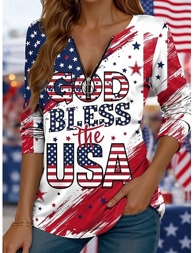 Día de la Independencia Aniversario Americano Patrón Camiseta para Mujer Gráfica Bandera Vintage Moda Estilosa de Manga Larga Cuello Redondo Tops Regulares Impresión Diario Con Cremallera Azul Blanco