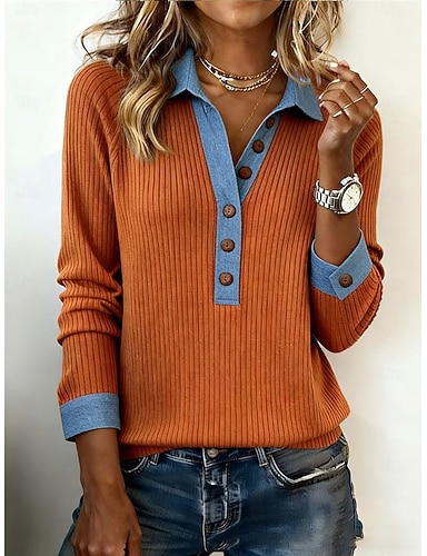 Mujer Polo Camiseta Sudaderas Botones Punk Activo Vintage Manga Larga Cuello de polo Diseño Tops regulares Casual Hogar Trabajo Azul Piscina Negro Naranja Verde Trébol Color Caquí Primavera Otoño