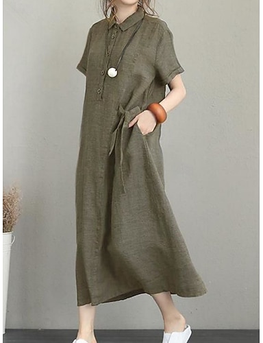 Vestido maxi de lino similar a algodón falso para mujer vestido de cambio vestido de verano casual diario ajuste holgado liso de manga corta con solapa negro verde gris oscuro verano
