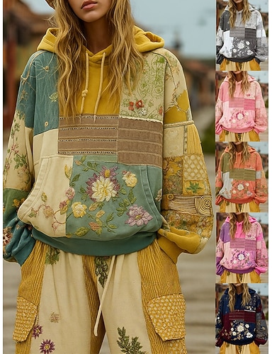 Mujer Sudadera con capucha Pullover Retazos Bolsillo Estampado Floral Plaid Vintage occidental Casual Manga Larga Con Capucha Tops regulares Calle Uso Diario Amarillo Rosa Vino Gris Oscuro Naranja