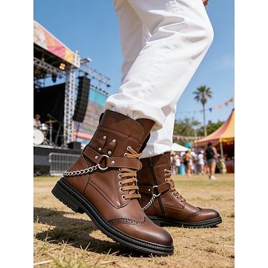 Botas de combate marrones para hombre con cordones, cremallera lateral y detalle de cadena. Botines para festivales de música, conciertos, eventos al aire libre, estilo urbano, fiestas y un estilo robusto y llamativo.