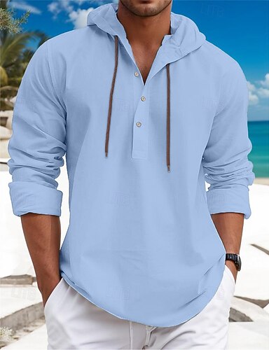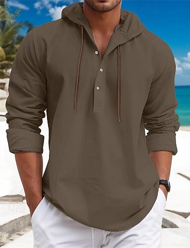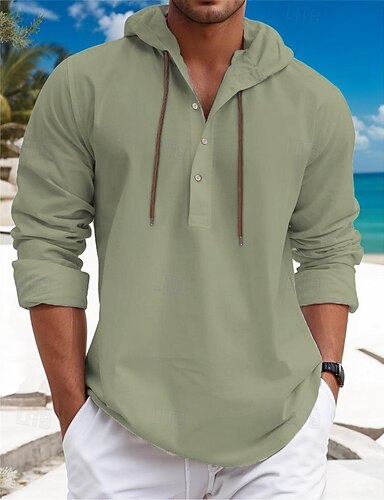 Hombre Camisa Camisa de lino de algodón Camisa de verano Camisa casual Camisa de playa Plano Casual Diario Negro Blanco Verde Claro Azul Piscina Manga Larga Con Capucha Primavera verano Ropa