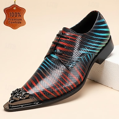 Zapatos Oxford de hombre con estampado de piel de serpiente rojo y azul, con cordones, punta afilada y puntera metálica. Ideales para bodas, banquetes, fiestas, graduaciones, actuaciones y ocasiones especiales.