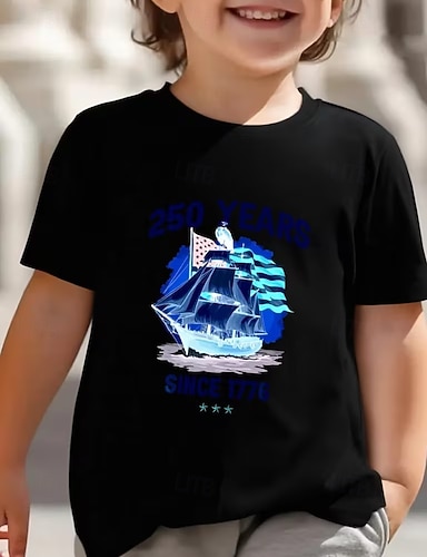 100% Algodón Niños Chico Azul Piscina Negro Blanco Graphic Águila 250 aniversario Camiseta Blusa Cuello Barco Manga Corta Exterior Uso Diario Moda Ropa de calle Design Estampado Verano Primavera
