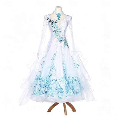 Vestido de competición de baile de salón americano para mujer, blanco y azul, con estampado floral, mangas acampanadas y pedrería.
