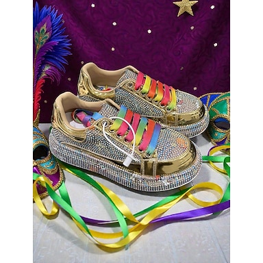 Zapatillas de pedrería arcoíris para mujeres de Mardi Gras con detalles metálicos dorados - Atrevidas y brillantes perfectas para carnaval fiestas de disfraces festivales y estilo callejero