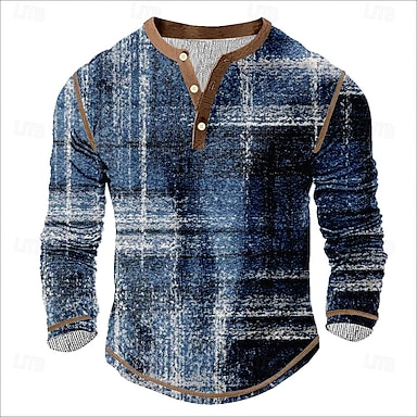 Hombre Graphic Plaid Henley Shirt Tee Manga Larga Vintage Moda Design Casual Diario Exterior Primavera & Otoño Marrón Verde Azul Oscuro Morado Henley Camiseta Henley