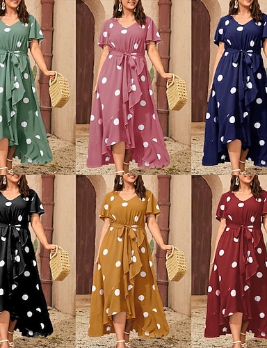 Mujer Vestido Midi Vestido de una línea Vestido de verano Casual Diario Ajuste regular A Lunares Manga Corta Escote en Pico Negro Amarillo Rosa Vino Verano Primavera