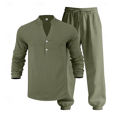 Hombre Camisa de lino 2 Piezas Camisa de manga corta Y Pantalones de lino Pantalones Pantalones casuales Establecer Plano Casual Diario Exterior Escote en Pico Manga Larga Verano Primavera Moda