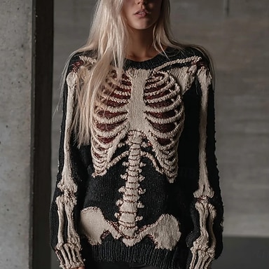Suéter de mujer Calavera Moda Casual Gráfica Esqueleto Cuello Redondo Parches Tejido Manga Larga Tops Regulares Tejido Negro Rosa Otoño Invierno