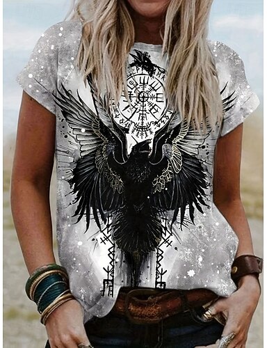 Camiseta Boho Viking para mujeres Gráfica Abstracta Vintage Bohemia Moda Vintage Manga Corta Manga Larga Cuello Redondo Tops Regulares Diarios Fin de Semana Impresión Azul Gris Claro Primavera Otoño