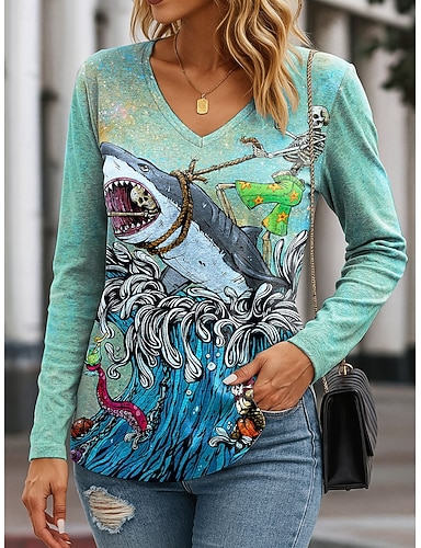 Calavera por David Lozeau W camiseta de mujer Cuello en V de Manga Larga Túnica Gráfico Calavera Océano Vintage Estilizada Moderna Tops Regulares Impresión Diaria
