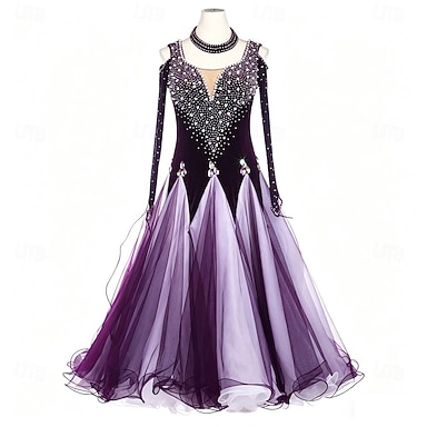Vestido de competición de baile de salón americano para mujer, con panel de ilusión de pedrería degradada en color púrpura.