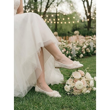 Zapatos de novia de punta puntiaguda con encaje blanco, malla ilusión y apliques florales: elegantes zapatos de boda para ceremonias y recepciones en el jardín.