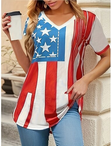 día de la independencia americana Mujer Camiseta Camiseta superior Estampado Bandera estadounidense Moda Elegante Clásico Manga Corta Escote en Pico Tops regulares Diario Noche Fin de semana Rojo