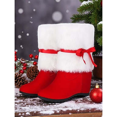 Botas de cuña con lazo y forro de piel roja para mujer: botas de invierno acogedoras para fiestas navideñas, Navidad, salidas informales y para climas fríos.