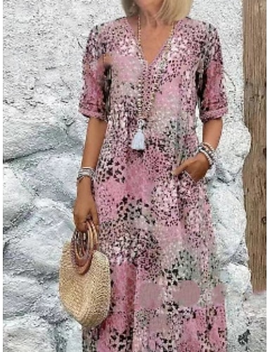 Mujer vestido largo vestido largo Vestido Estampado Moda Manga de la linterna Vacaciones Festivos Noche Ajuste regular Flor Media Manga Escote en Pico Morado Naranja Rosa Rojo Verano