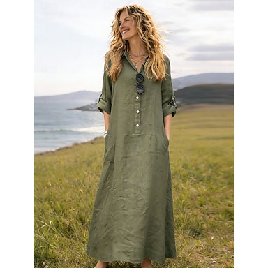Mujer Vestido maxi Lino de algodón sintético Vestido de Camisa Vestido informal Básico Casual Diario Vacaciones Ajuste regular Plano Manga Larga Cuello Camisero Rosa Verde Trébol Gris Primavera Otoño