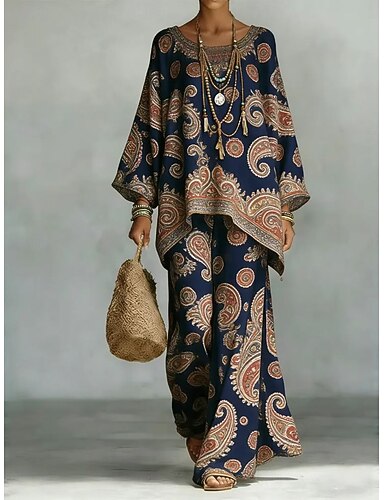Mujer Camisa Conjuntos de lino y algodón Conjuntos de pantalones Manga Larga Campana Escote Redondo Graphic Cachemir Estampado Vacaciones Moda Ropa de calle Casual Diario Exterior Blanco Azul Marino