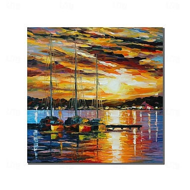 Pintura al óleo hecha a mano, lienzo, arte de pared, decoración, atardecer, pueblo, ciudad costera, océano, paisaje, textura, abstracto, cielo naranja, pintura a cuchillo para decoración del hogar,