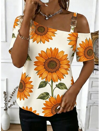 Mujer Camiseta Camiseta superior Estampado Graphic Foco Multicolor Moda Clásico Casual Manga Corta Un Hombro Tops regulares Diario Noche Fin de semana Azul Piscina Blanco Rosa Verano Primavera