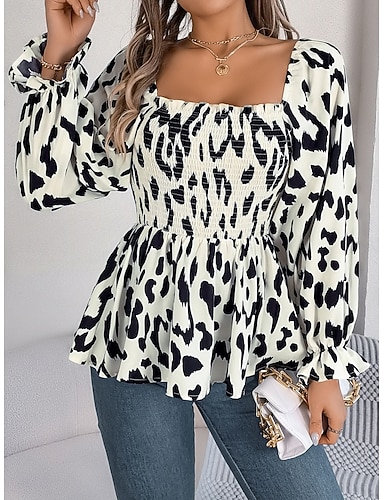 Mujer Camisa Blusa Tops de gasa Leopardo Elegante Clásico Moderno Manga Larga Escote Cuadrado Tops regulares Diario Festivos Noche Negro Blanco Verde Trébol Primavera Otoño