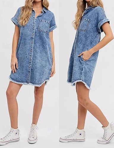 Mujer Mini vestido Vestido de mezclilla Vestido informal Vestido de verano Moda Exterior Festivos Cita Ajuste regular Plano Manga Corta Cuello Camisero Azul Piscina Verano Primavera