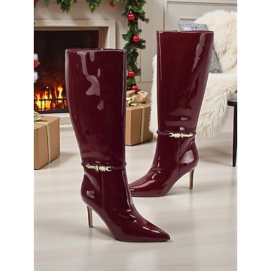 Botas altas hasta la rodilla de piel sintética charol burdeos para mujer con detalle de hebilla dorada, punta puntiaguda, elegante tacón de aguja, perfectas para Navidad, fiestas navideñas y ocasiones festivas.