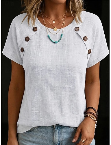 Mujer Camiseta Camiseta superior Botones Plano Moda Elegante Clásico Manga Corta Cuello Barco Tops regulares Diario Noche Fin de semana Azul Piscina Blanco Amarillo Rosa Verde Trébol Verano Primavera