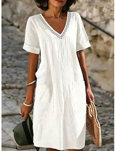 Mujer Vestido hasta la Rodilla Vestido blanco Vestido informal Vestido de verano Elegante Moda Playa Vacaciones Festivos Holgado Plano Manga Corta Escote en Pico Azul Piscina Negro Blanco Amarillo