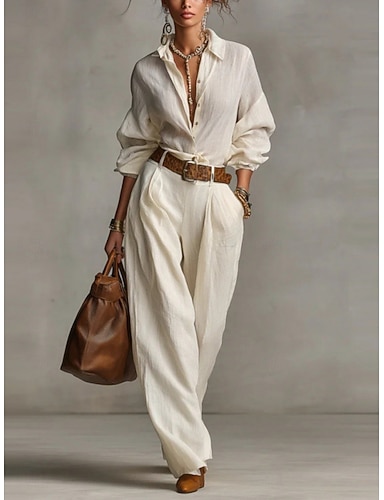 Mujer Conjuntos de pantalones parte superior del bolero Manga Larga Cuello Camisero Plano Frunce Elegante Moda Ropa de calle Casual Diario Exterior Blanco Verano Holgado