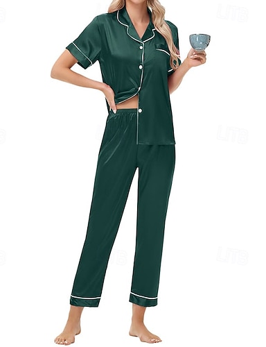 Mujer Ropa de salón Conjunto pijama Moda Casual Suave Color puro Retazos Cintura elástica Botones Pantalón Hogar Vacaciones Manga Corta Diseño Negro Champaña Rosa Vino Verde Trébol Verano Primavera